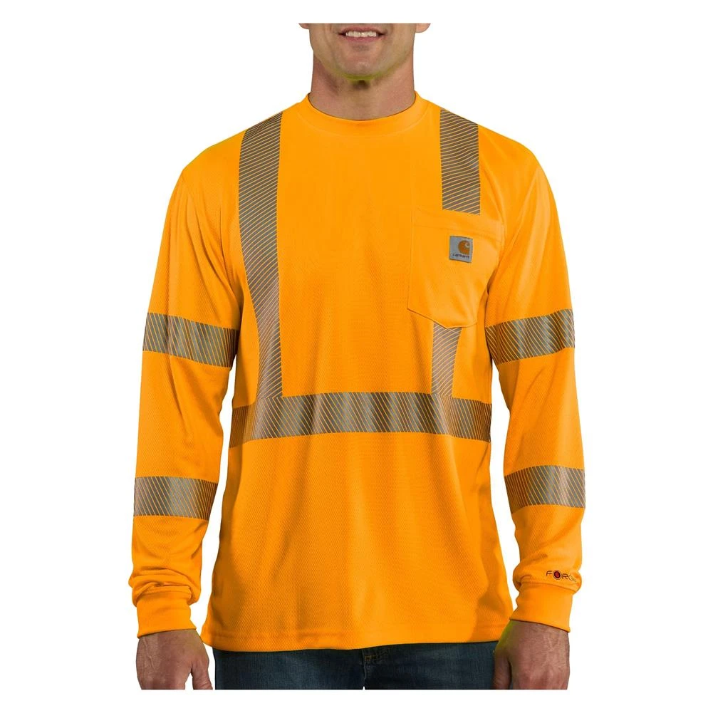 Stay visible with the Carhartt Force Hi-Vis Class 3 Long Sleeve T-Shirt. The lightweight and breathable 4.25 oz. knit polyester keeps you cool while the FastDry technology wicks away moisture and sweat so you can stay dry and focused on your day. Stain Breaker technology releases stains so you look good wash after wash. This shirt is equipped with 3M Scotchlite reflective stripes, which are ANSI Class 3, Level 2 compliant and will stand out to ensure you are seen. These stripes are made to bend and stretch with the fabric. The segmented trim # 5510 has also been shown to maintain performance through 75 home launderings. A tagless neck label and rib-knit cuffs allow you to focus on your work, and the long sleeve style adds protection while remaining cool and breathable even in warmer weather.
