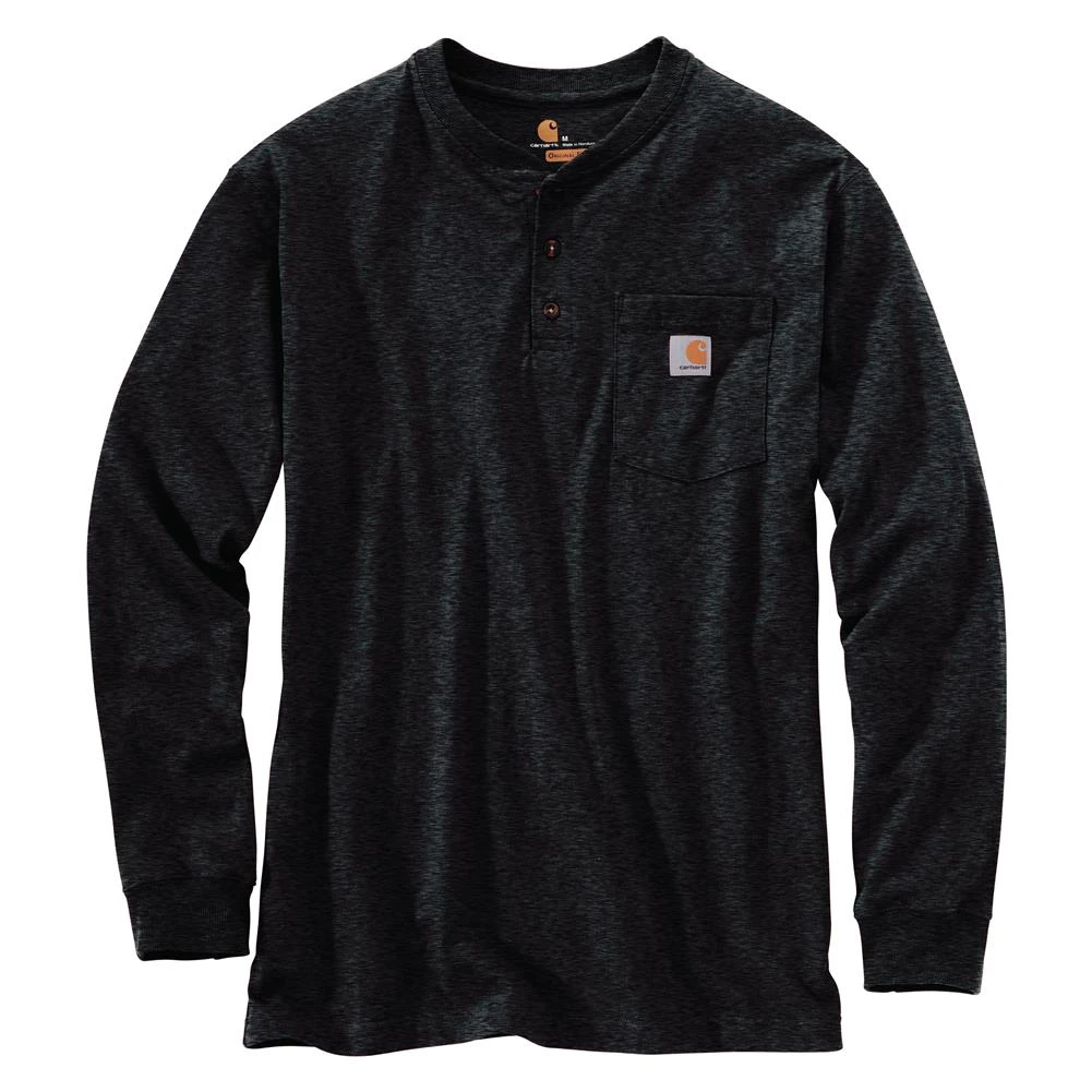The Carhartt Long Sleeve Workwear Pocket Henley delivers non-stop comfort and durability on the job. Made with ultra-soft 100% cotton jersey knit, this shirt uses a side-seamed construction to minimize twisting, and features a rib-knit collar and cuffs for a comfortable fit. The tagless neck label eliminates the skin irritation caused by ordinary neck tags. On the front of the shirt, a left chest pocket with a sewn-on Carhartt label keeps small accessories close at hand. Designed with a three-button front placket for a sharp look, this long sleeve shirt keeps you comfortable throughout the toughest jobs without limiting your performance.