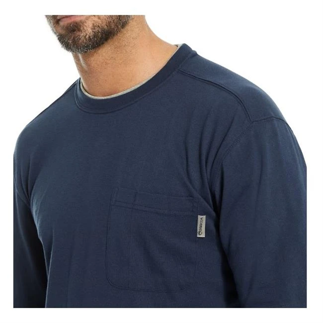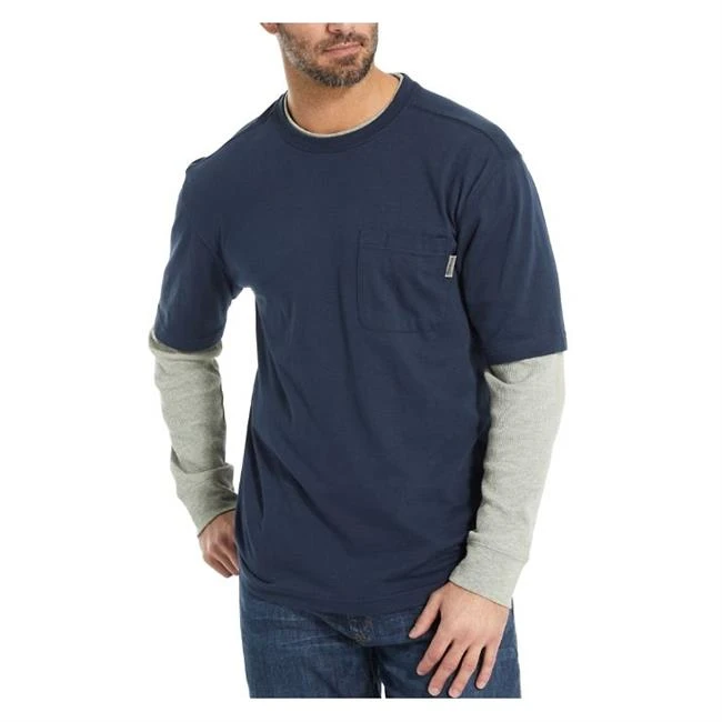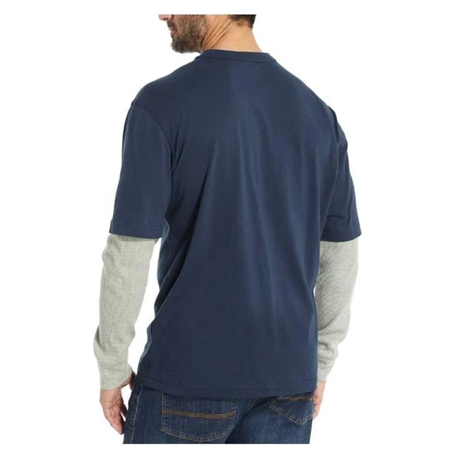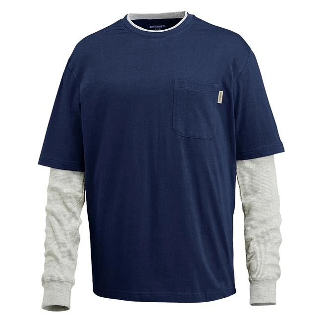 Get the warmth of two layers in one garment with the Wolverine Miter II Tee. This shirt consists of faux double-layer waffle knit sleeves sewn at the shoulders under a cotton tee for a warm, comfortable feel without the hassle of putting on two shirts. The sleeves are made with a blend of cotton and polyester fabric for maximum comfort. The tagless neck label rests comfortably against your skin, eliminating the annoyance and irritation commonly associated with ordinary neck tags. On the front of the shirt, the left chest pocket has an opening for keeping writing utensils close at hand. Featuring rolled shoulders and a double-ribbed neck opening for a perfect fit, this shirt combines superior warmth and comfort with a casual look.